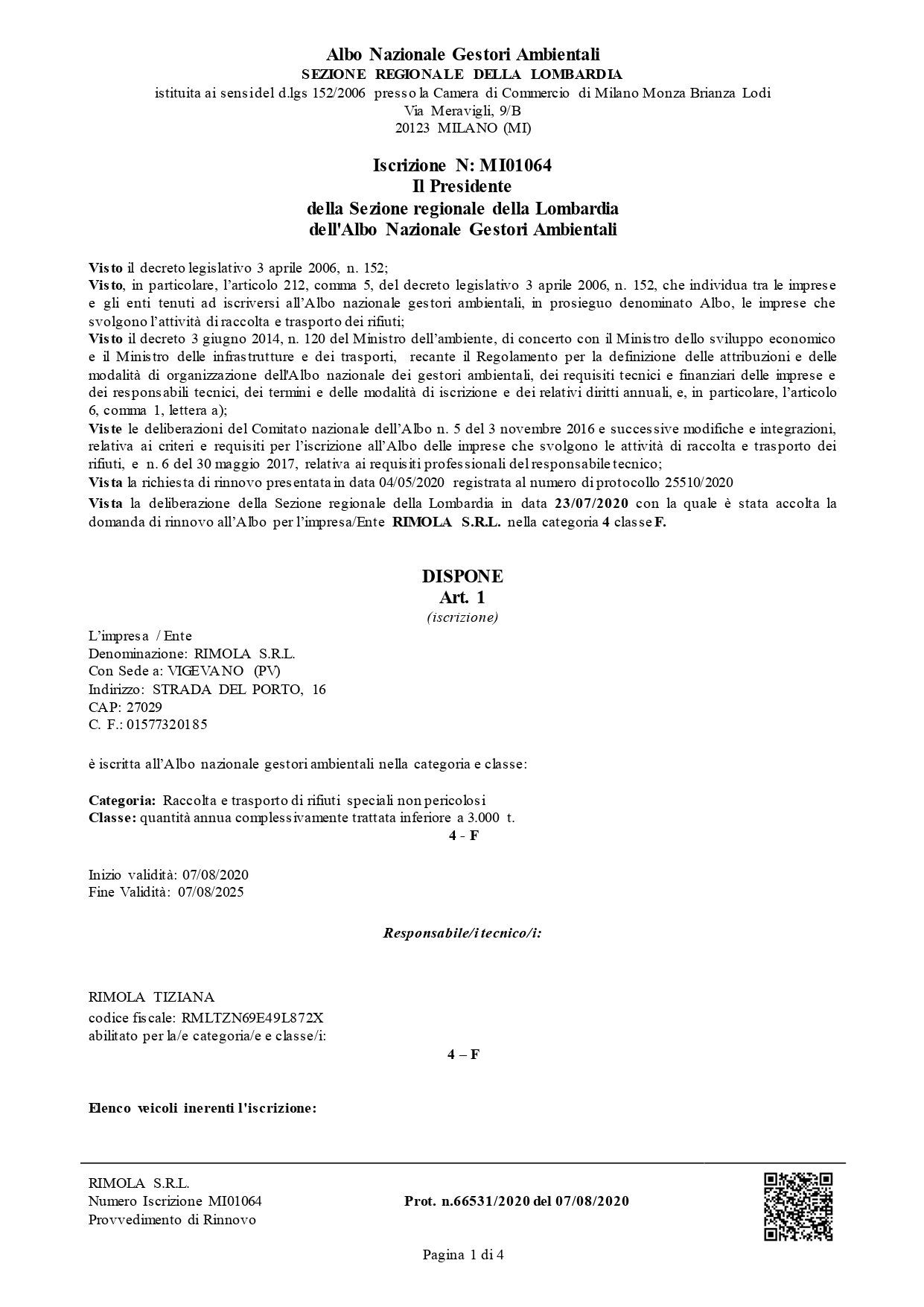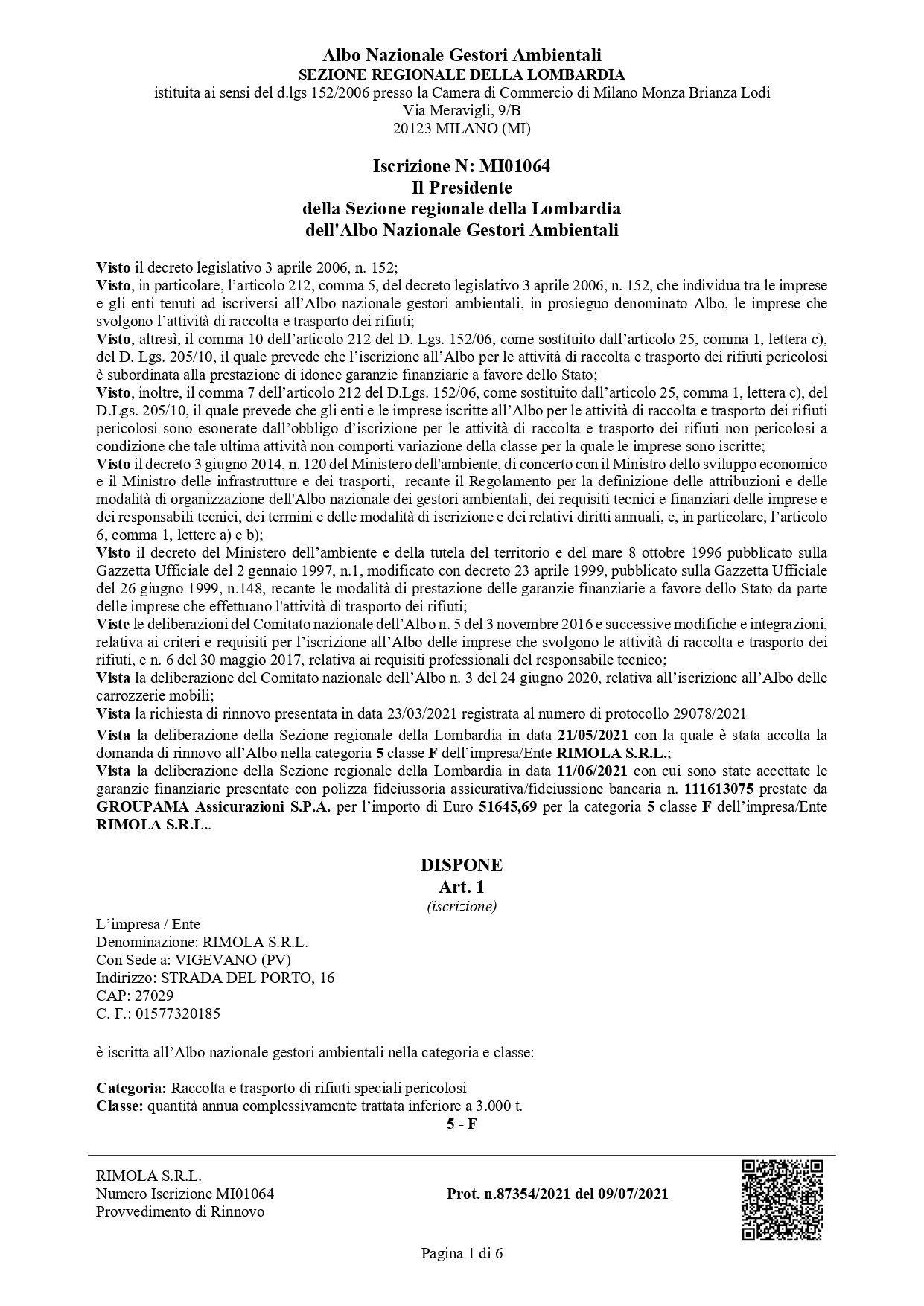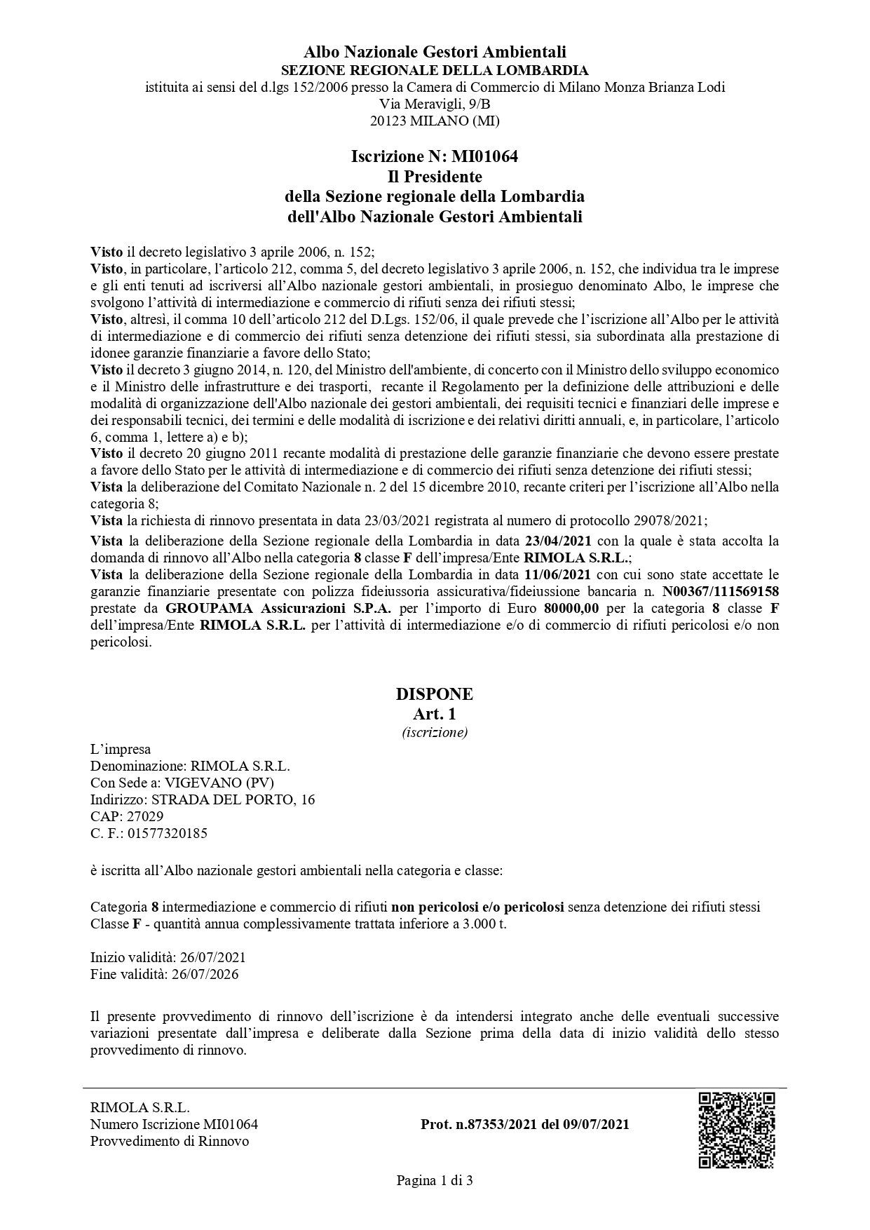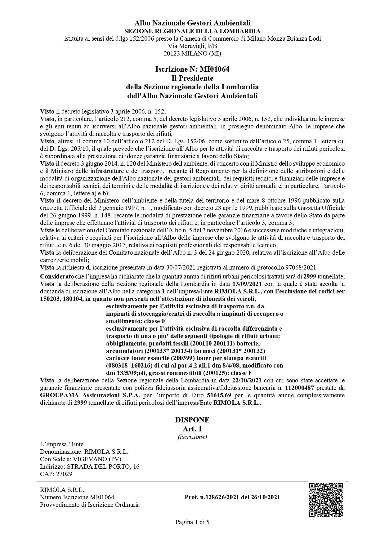 Rimola srl dispone delle autorizzazioni presso l'Albo Nazionale dei Gestori Ambientali previste dalla norma vigente,
